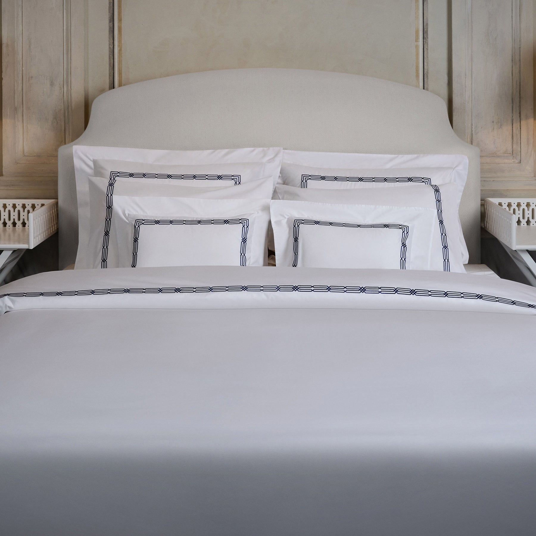 This duvet cover features an elegant embroidered design created through the interplay of linear forms. Its smooth, soft-textured fabric highlights the embroidery’s clean definition, lending the design a refined expression. 100% finest combed cotton sateen. Made in Türkiye.