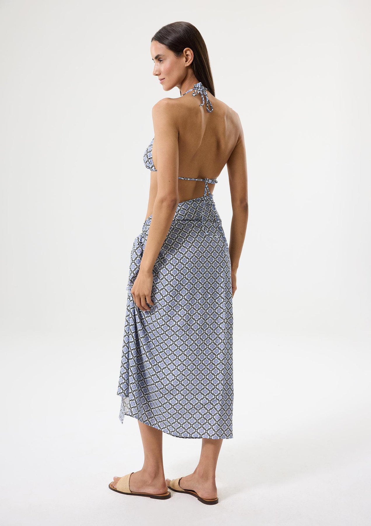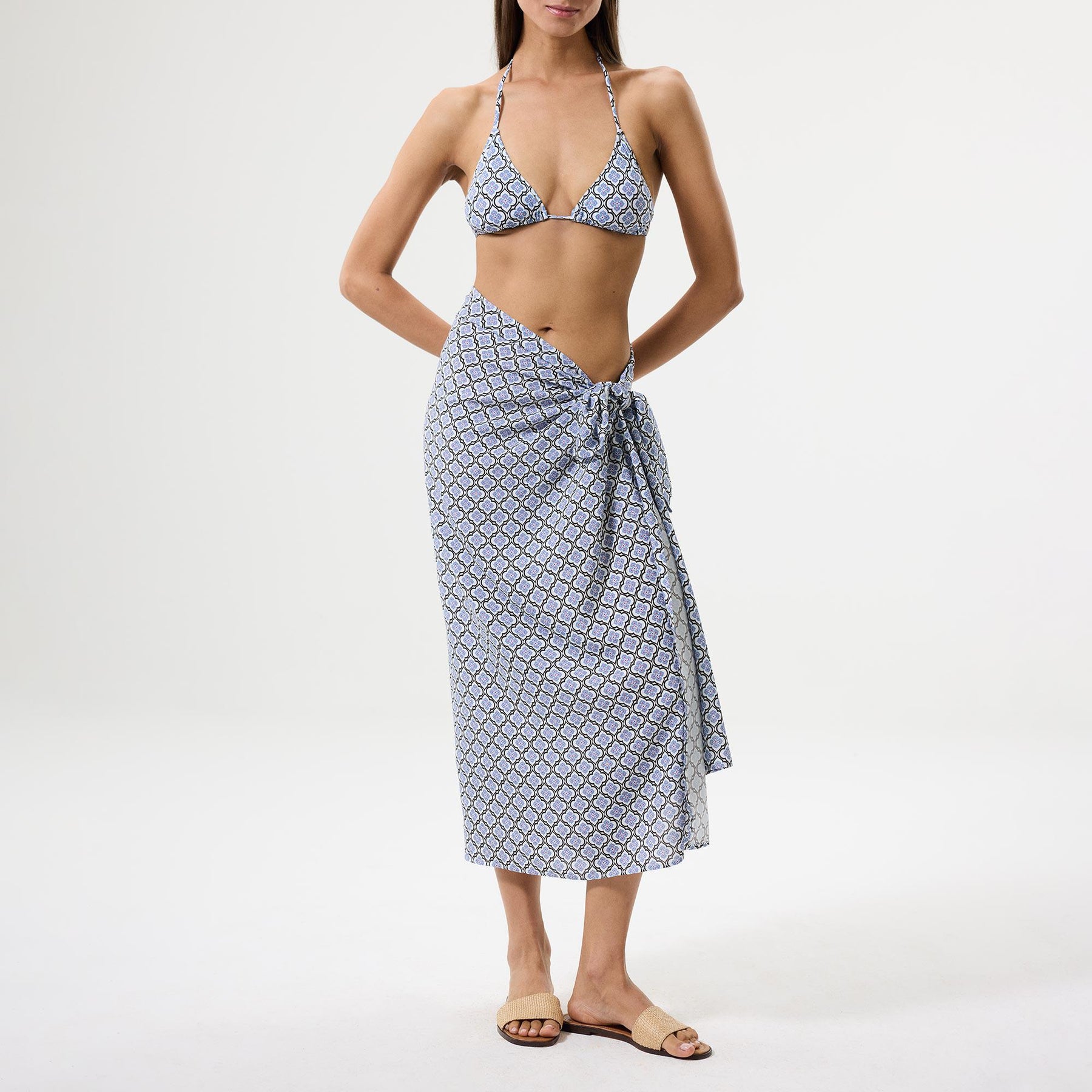 This pareo is made from 100% viscose and designed in a wrap silhouette with self-tie detailing at the waist. It is adorned with an geometric flower motif. 100% viscose. Made in Türkiye.