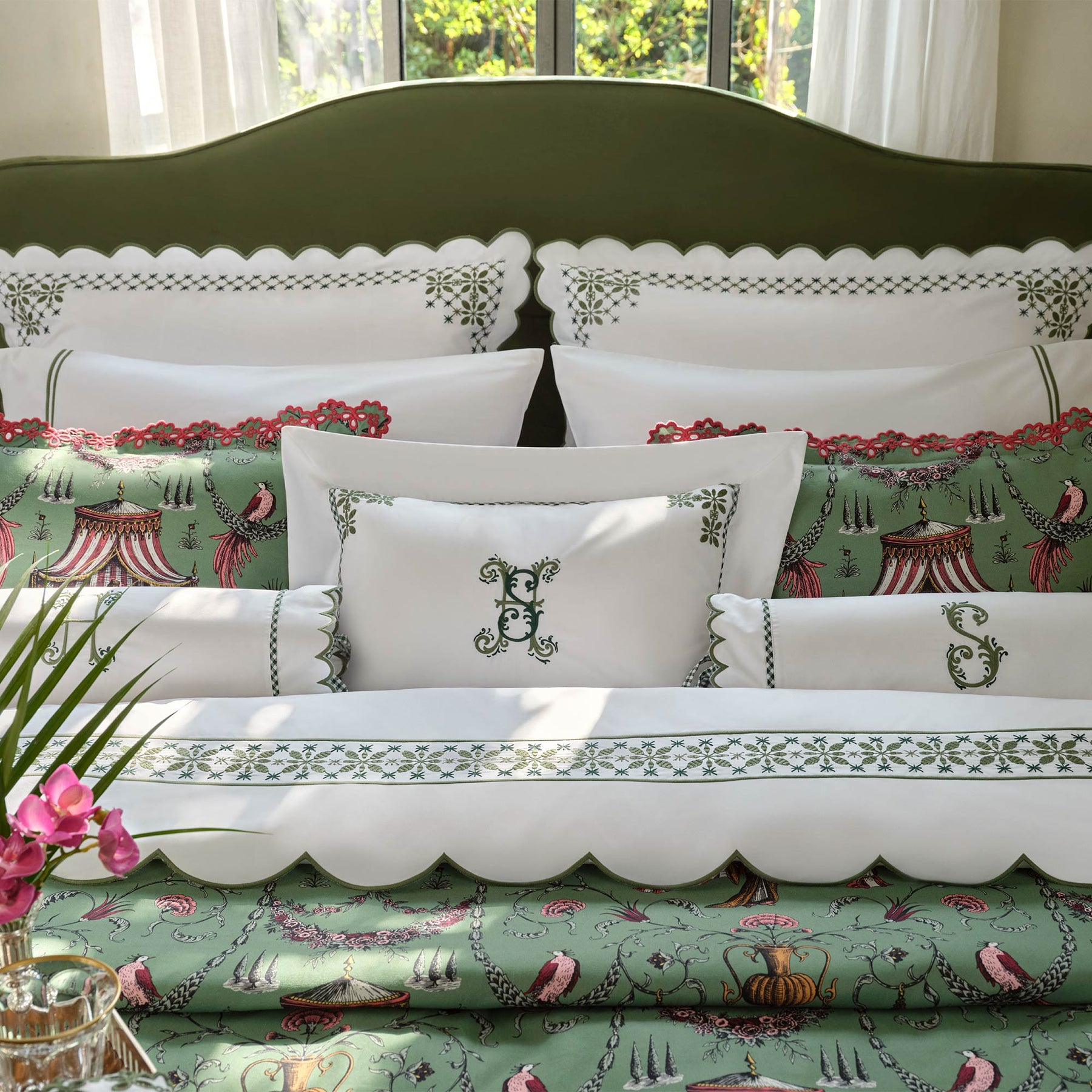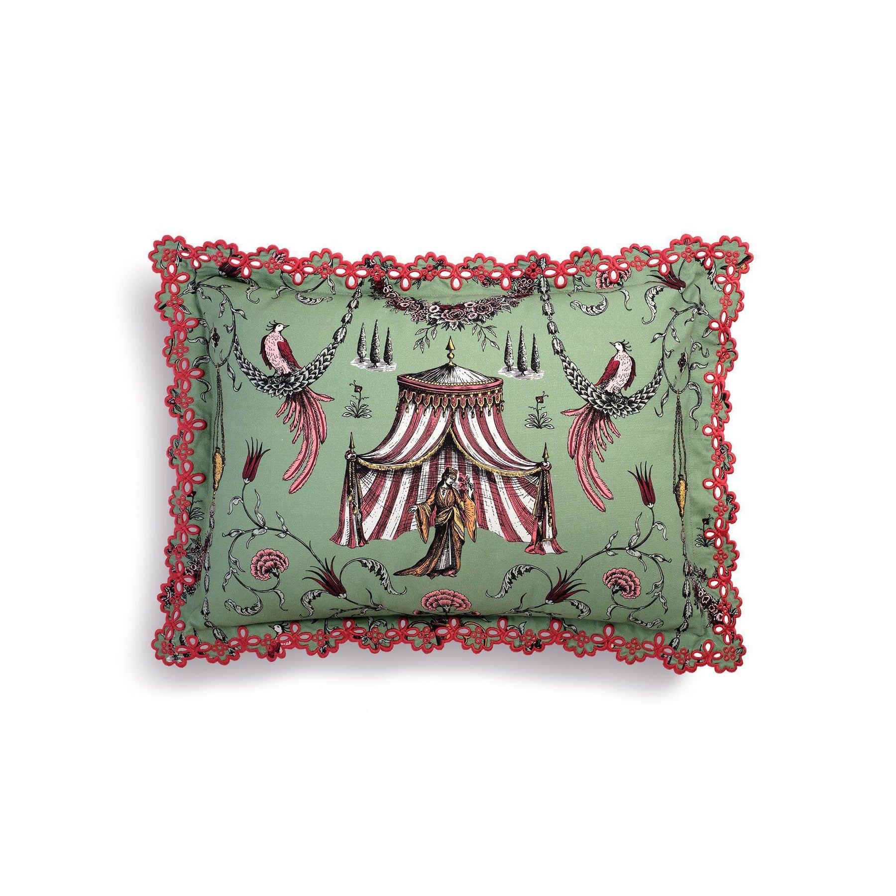 Crafted with the main pattern of the Seferî Collection, this decorative cushion reflects the story of the collection on a green background with its tent motif, birds, and natural elements. Designed in the Toile de Jouy technique, the motifs are brought together in a grotesque style. The openwork embroidery framing the edges gives the cushion an elegant finishing touch. Material: 100% cotton. Made in Turkey.